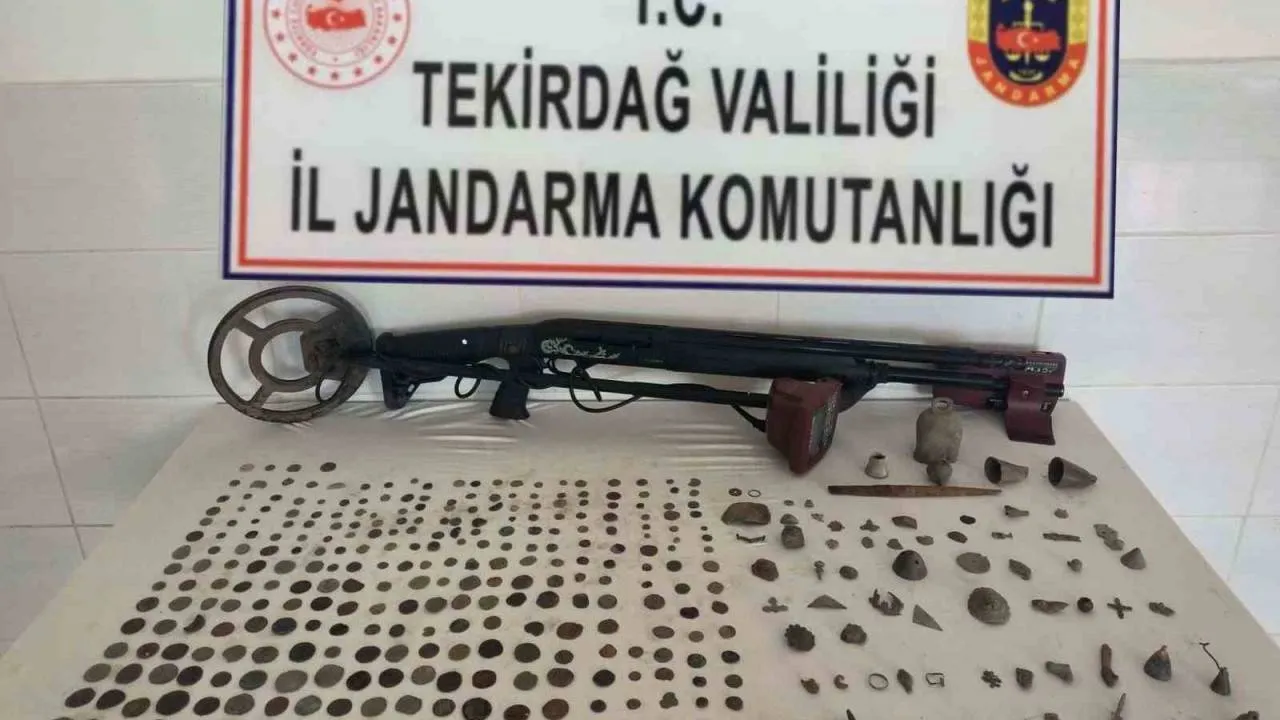 Tekirdağ’ın Kapaklı ilçesi Atatürk Mahallesinde ikamet eden Ç.G isimli şahsın ikamet adresinde ve aracında tarihi eser objelerinin bulunduğu yönünde bilgi alınması üzerine Tekirdağ İl Jandarma Komutanlığı ekiplerince adreste arama yapıldı. Yapılan aramada, 312 sikke, 76 adet tarihi eser objesi, 1 adet dedektör, 1 adet ruhsatsız av tüfeği ele geçirildi. Ayrıca şahsa 2521 SKM suçundan 2 bin 864 TL idari para cezası uygulandı. Şüpheli ifadesi alındıktan sonra serbest bırakıldı.