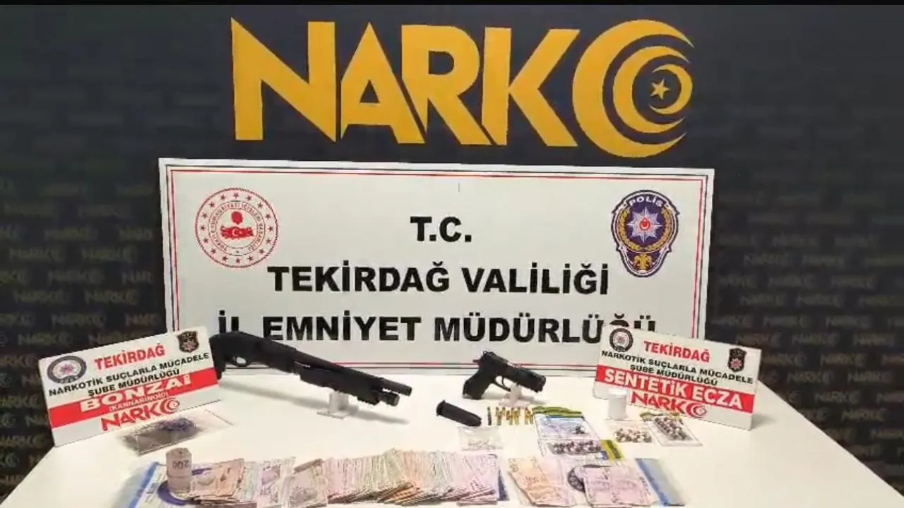 Tekirdağ İl Emniyet Müdürlüğü Narkotik Suçlarla Mücadele Şube Müdürlüğü ekipleri, uyuşturucu satıcılarına yönelik yürüttükleri çalışmalar kapsamında Aydoğdu ve Karadeniz Mahallelerinde belirlenen 8 ayrı adrese eş zamanlı operasyon düzenledi. Operasyonlarda piyasa değeri yaklaşık 55 bin TL olan uyuşturucu hap ve uyuşturucu madde, 46 bin 995 Tl para, 1 adet ruhsatsız tüfek, 1 adet ruhsatsız tabanca ve 17 adet tabanca fişeği ele geçirildi.