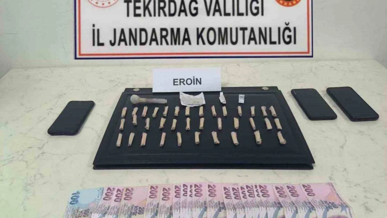 Tekirdağ İl Jandarma Komutanlığı ekiplerince yapılan çalışmalarda Çerkezköy İstasyon Mahallesi’nde A.S., E.B. ve S.A. isimli şahısların uyuşturucu madde getirdikleri tespit edildi. Yapılan yol kontrol ve aramalarda 38 fişek eroin, 1 adet payp ve suçtan elde edilen 3 bin 500 TL para ele geçirildi. Şüpheli şahıslar A.S., S.B. ve S.A. uyuşturucu imal ve ticareti suçundan gözaltına alındı.