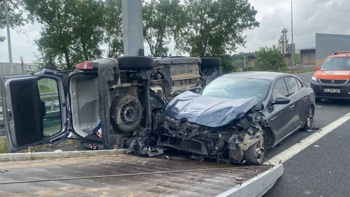 TEM Otoyolu Kocaeli geçişinde otomobil ile çarpışan hafif ticari araç yan yattı, araçlarda bulunan 4 kişi ise kazayı hafif sıyrıklarla atlattı.