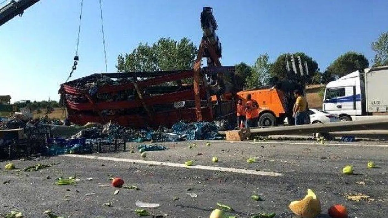 TEM Otoyolu Silivri mevkiinde meyve ve sebze yüklü kamyon bariyerlere devrildi.