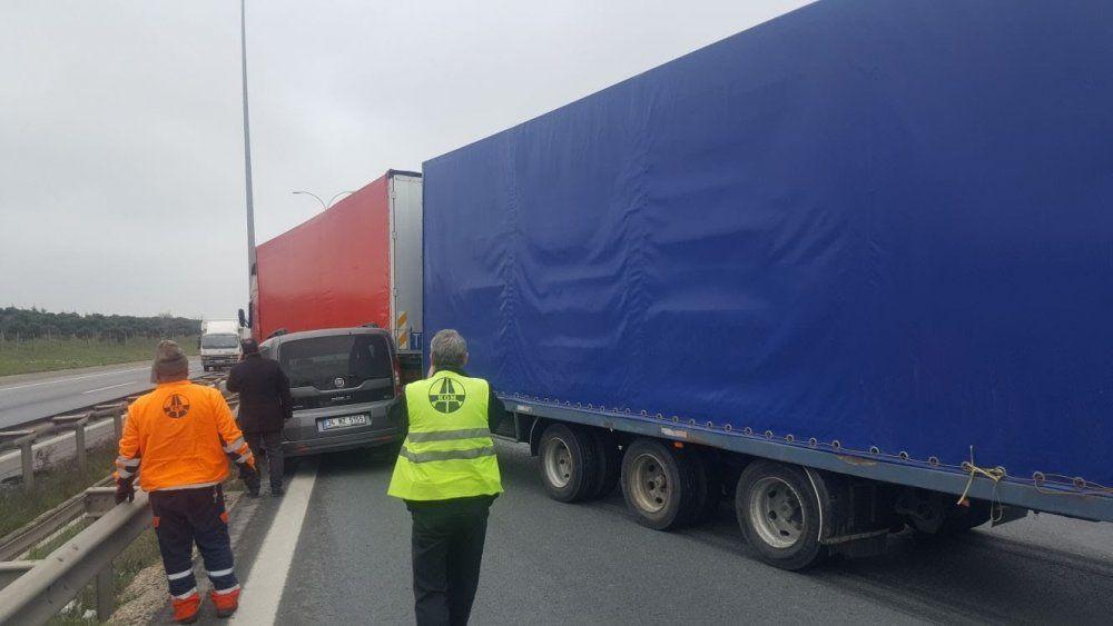 Kaza, bugün TEM otoyolu Edirne istikameti Kınalı mevkiinde meydana geldi. Edinilen bilgilere göre yabancı plakalı tır ile Y.B. yönetimindeki tüp yüklü kamyon çarpıştı. Arkadan seyir halindeki özel bir araçta bariyerlere çarpan tıra çarptı.