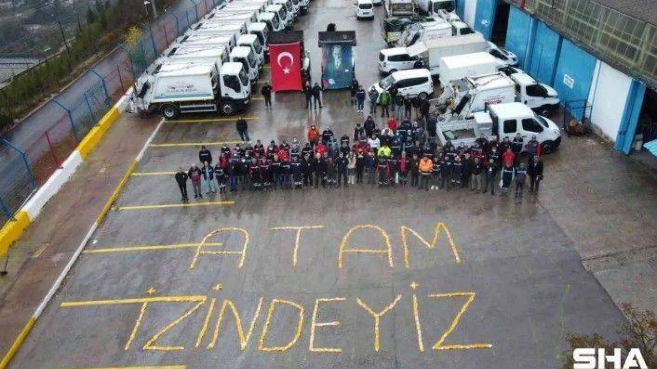 Kocaeli’de İzmit Belediyesi’ne bağlı temizlik personelleri eldivenleriyle "Atam izindeyiz" yazarak, Ulu Öner Mustafa Kemal Atatürk’ü andı.