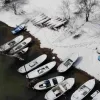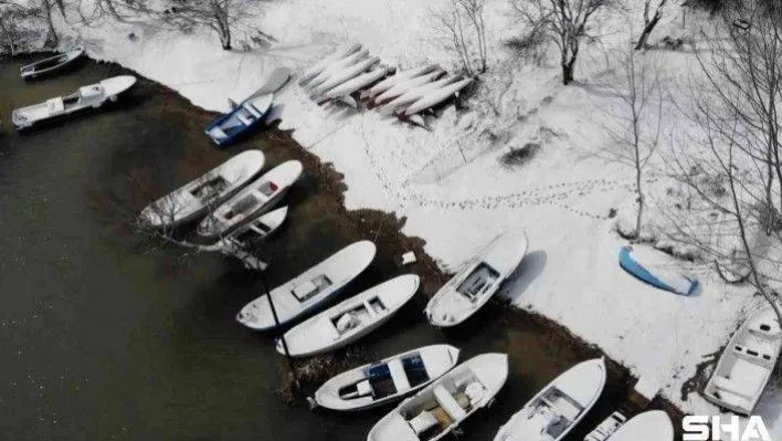 İstanbul'da etkili olan kar yağışının ardından Terkos Gölü'nde oluşan kartpostallık kar manzarası dron ile görüntülendi.
