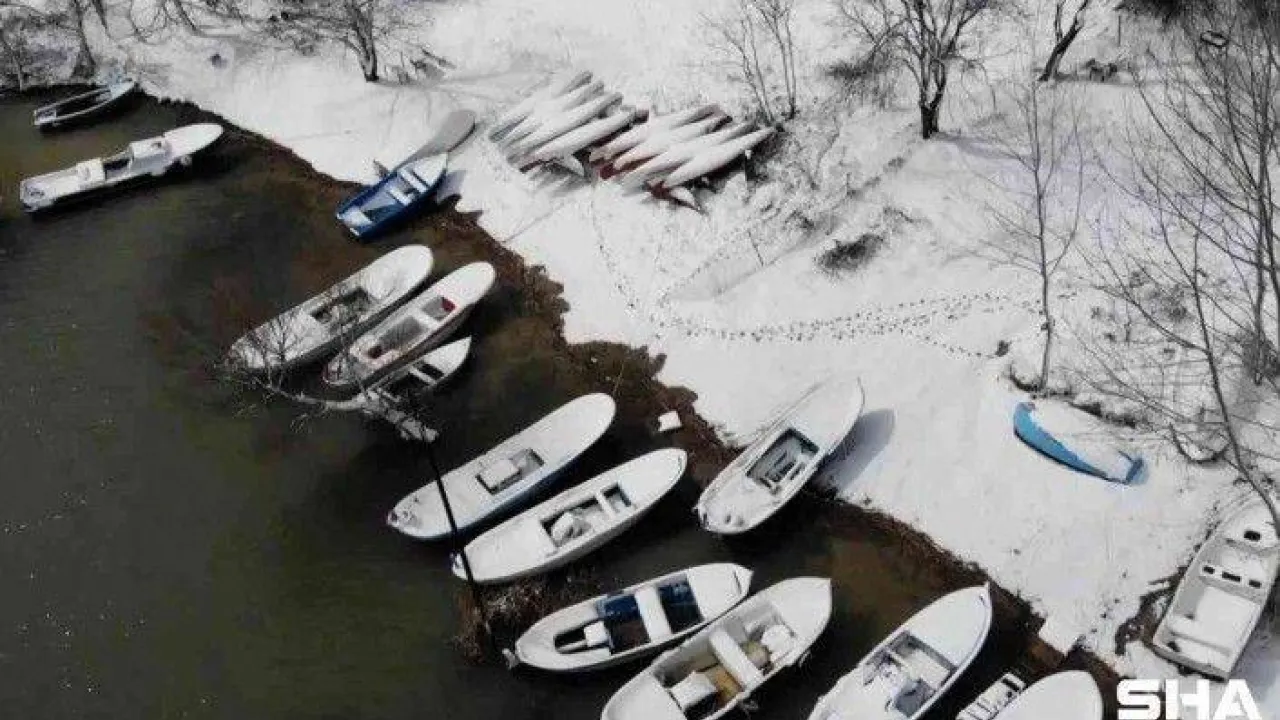 İstanbul’da etkili olan kar yağışının ardından Terkos Gölü’nde oluşan kartpostallık kar manzarası dron ile görüntülendi.