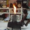 Terzi kömürlü ütüyle kumaşları ütülüyor