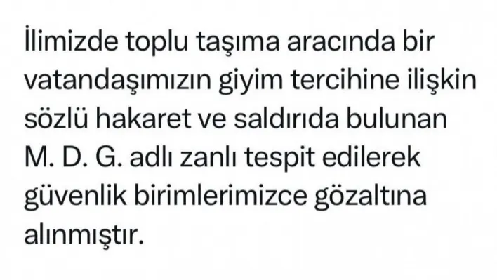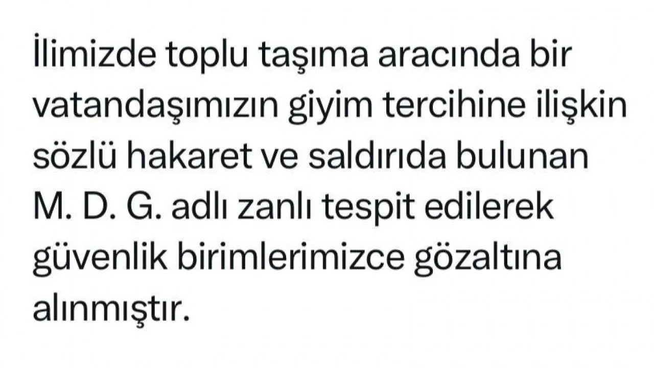 Kocaeli Valisi Seddar Yavuz, sosyal medya hesabından yaptığı açıklamada, "İlimizde toplu taşıma aracında bir vatandaşımızın giyim tercihine ilişkin sözlü hakaret ve saldırıda bulunan M.D.G. adlı zanlı tespit edilerek güvenlik birimlerimizce gözaltına alınmıştır. Bireysel hak ve özgürlükleri korumaya kararlıyız" dedi.