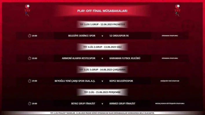 Türkiye Futbol Federasyonu’nun resmi internet sitesinden konuyla ilgili yapılan açıklamada, TFF 2. Lig ve TFF 3. Lig’de 12, 13, 14, 15 Haziran tarihlerinde oynanacak olan play-off final müsabakalarında VAR sisteminin uygulanacağı duyuruldu.