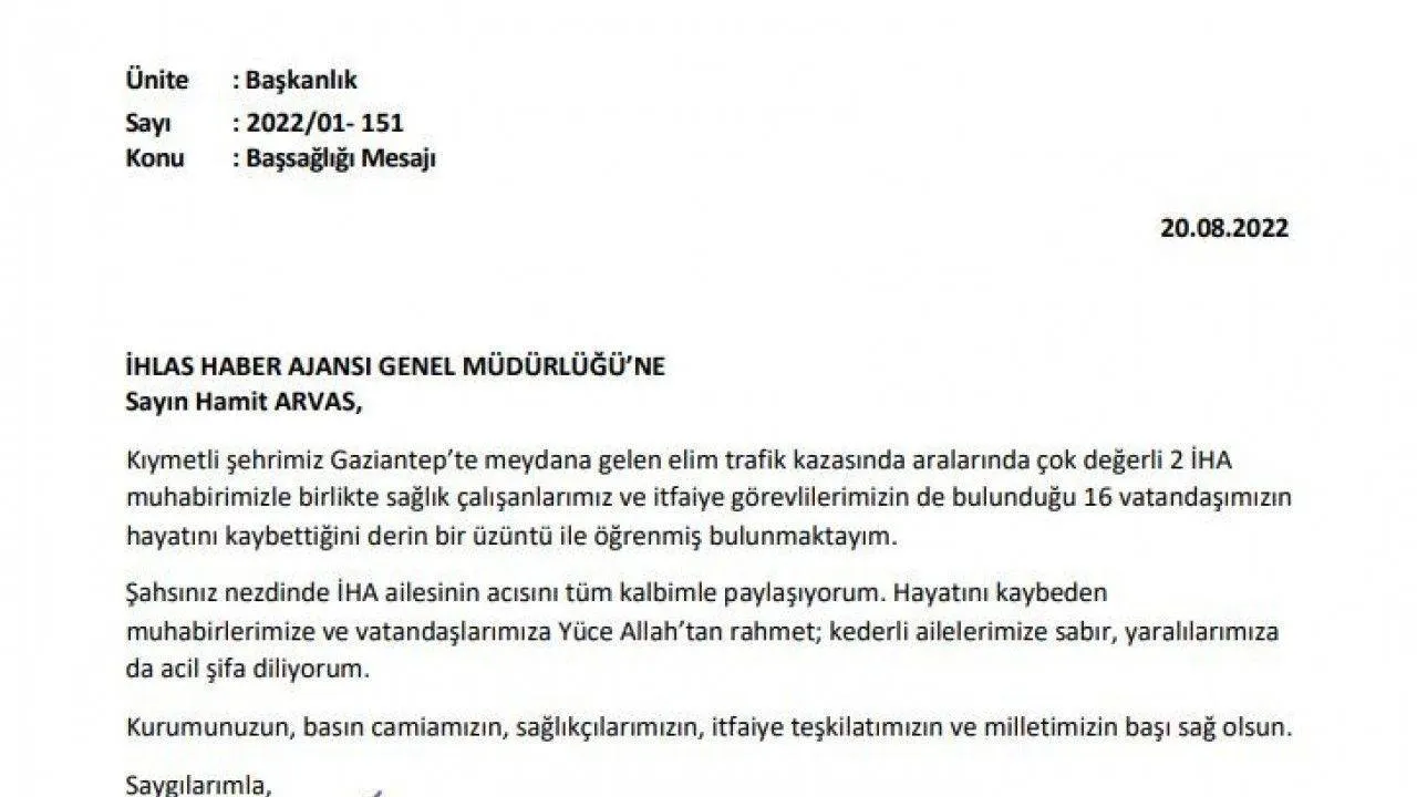 "Kıymetli şehrimiz Gaziantep’te meydana gelen elim trafik kazasında aralarında çok değerli 2 İHA muhabirimizle birlikte sağlık çalışanlarımız ve itfaiye görevlilerimizin de bulunduğu 16 vatandaşımızın hayatını kaybettiğini derin bir üzüntü ile öğrenmiş bulunmaktayım. Şahsınız nezdinde İHA ailesinin acısını tüm kalbimle paylaşıyorum. Hayatını kaybeden muhabirlerimize ve vatandaşlarımıza Yüce Allah’tan rahmet; kederli ailelerimize sabır, yaralılarımıza da acil şifa diliyorum. Kurumunuzun, basın camiamızın, sağlıkçılarımızın, itfaiye teşkilatımızın ve milletimizin başı sağ olsun."