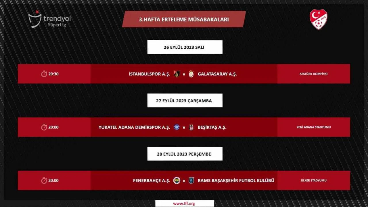 Süper Lig’in 3. haftasında oynanması planlanan İstanbulspor - Galatasaray, Adana Demirspor - Beşiktaş ve Fenerbahçe - Başakşehir müsabakaları, takımların Avrupa kupalarında oynayacakları play-off maçları Türkiye Futbol Federasyonu (TFF) tarafından ileri bir tarihe ertelenmişti. TFF’den yapılan açıklamada bu mücadelelerin tarihleri açıklandı. Buna göre ertelenen karşılaşmalarının tarihi ve saatleri şöyle: