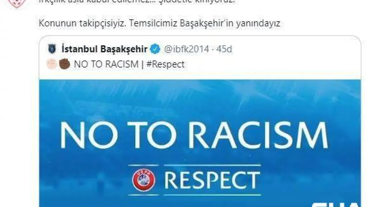 Türkiye Futbol Federasyonu, Paris Saint Germain maçında 4. hakem tarafından Başakşehir Yardımcı Antrenörü Pierre Webo'ya yapılan ırkçılık sonrası yaptığı paylaşımda, konunun takipçisi olduklarını ve turuncu-lacivertlilerin yanında olduklarını açıkladı.