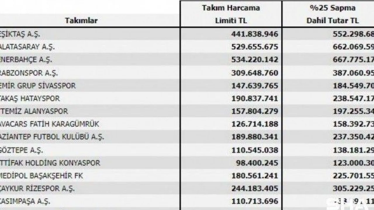 Buna göre yüzde 25 sapma ile birlikte en yüksek takım harcama limitine sahip takım 667 milyon 775 bin 177 TL’yle Fenerbahçe oldu. Sarı-lacivertlileri, 662 milyon 069 bin 594 TL ile Galatasaray ve 552 milyon 298 bin 683 TL tutarla Beşiktaş takip etti.