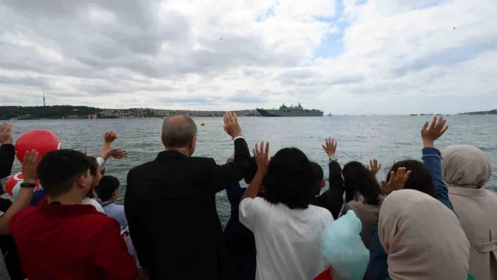 Dünyanın ilk SİHA gemisi TCG Anadolu, İstanbul Boğazı'ndan geçti. Dev gemi, boğazı geçişi sırasında Dolmabahçe'de Cumhurbaşkanı Recep Tayyip Erdoğan'ı selamladı.