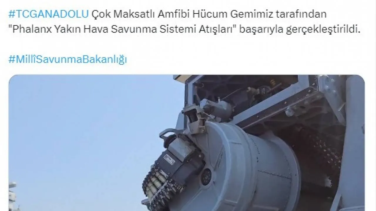 TGC Anadolu’da nefes kesen "Phalanx Yakın Hava Savunma Sistemi Atışları" görüntüleri, Milli Savunma Bakanlığının sosyal medya hesabından paylaşıldı. Paylaşımda, “Gurur! TGC Anadolu çok maksatlı amfibi hücum gemimiz tarafından ‘Phalanx Yakın Hava Savunma Sistemi Atışları’ başarıyla gerçekleştirildi” ifadelerine yer verildi.
