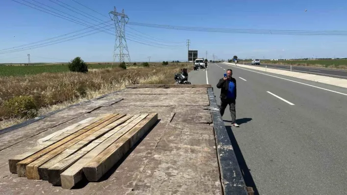 Tekirdağ'ın Muratlı ilçesinde tır dorsesinden düşen kalasa çarpan motosikletin sürücüsü yaralandı.