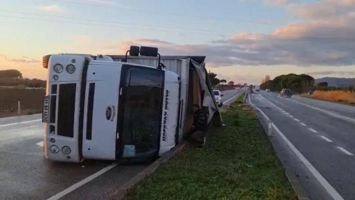 Balıkesir'in Ayvalık ilçesinde sürücüsünün hkimiyetinden çıkan TIR yolun ortasında yan yatarak devrildi. Kazada hafif yaralanan TIR şoförü yan dönen araçtan güçlükle dışarı çıkabildi.