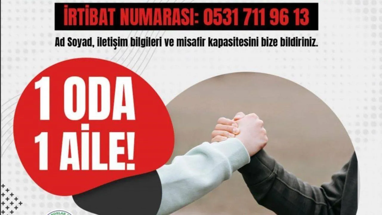 Mersin’in merkez ilçe Toroslar Belediyesinden yapılan açıklamaya göre, belediye, sosyal medya hesaplarından paylaşarak duyurduğu “1 Oda, 1 Aile” kampanyası için “Kardeşlerine yardım etmek isteyen güzel kalpli insanlar! Evinizdeki bir odanızın misafirleri sizleri bekliyor” mesajı ile Mersinlilerden destek istedi.