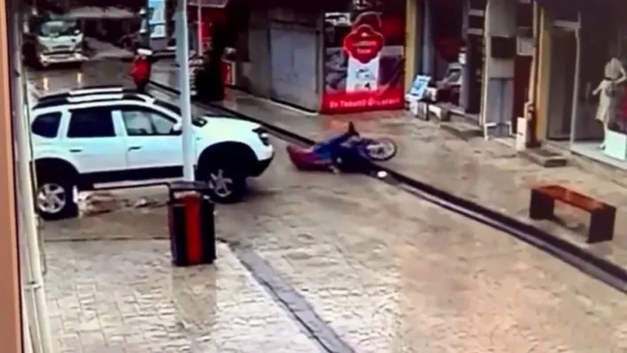 Talihsiz kaza, saat 13.10 sıralarında Muratlı ilçesinde trafiğe kapalı Kaymakam Erol Okyay Caddesi üzerinde meydana geldi. İddiaya göre, yağışlardan ötürü zemini kayganlaşan cadde üzerinde ilerleyen motosikletli sürücü, yan yoldan önüne çıkmak isteyen aracı görünce direksiyon hakimiyetini kaybederek kaza yaptı. Motosikletten düşen sürücü şans eseri yara almazken, motosiklette maddi hasar meydana geldi. Kaza anı ise güvenlik kamerası tarafından kaydedildi.
