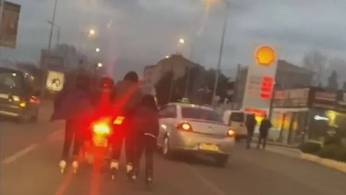 Çorlu ilçesi Kazımiye Mahallesi Salih Omurtak Caddesi eski Şifa mevkiinde 3 genç, kullandıkları patenin amacı dışına çıktı. Motosiklete tutunarak yolculuk ederken keyif çattığını sanan 3 genç, başlarına gelebilecek kaza tehlikesine bile aldırış etmedi. Motosiklet sürücüsünün de bu durum karşısında duyarsız kalması tepki çekti.