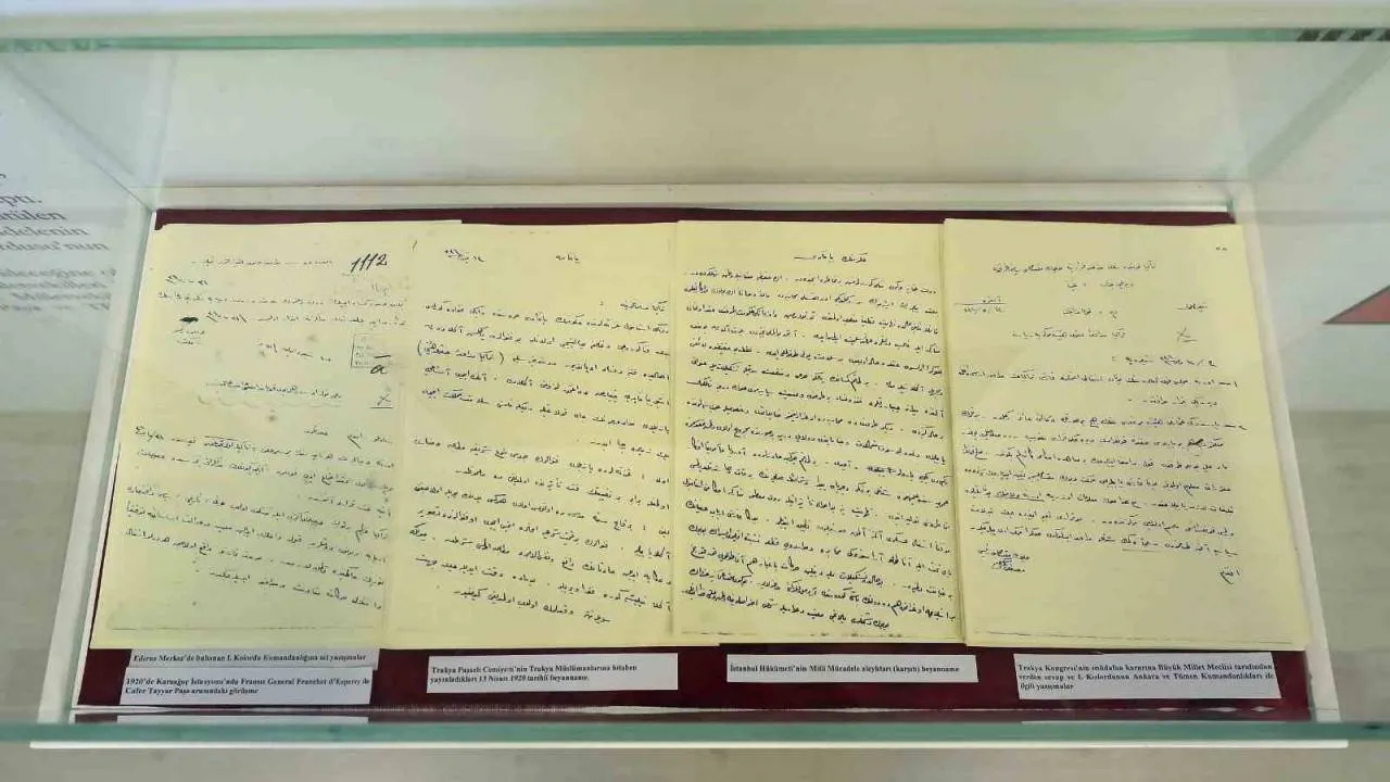 Heyet-i Temsiliye ile I. Kolordu Kumandanlığı arasındaki yazışmalar, Birinci Kolordu Kumandanlığı’nın bağlı tümenlerle yaptığı karşılıklı yazışmalar, I. Kolordu Kumandanı Cafer Tayyar Bey’in 6 Mayıs 1920’de Karaağaç İstasyonunda Fransız Generali Louis Franchet d’esperey ile yaptığı görüşmeye ait evrak, Trakya Paşaeli Cemiyeti’nin 13 Nisan 1920’de Trakya Müslümanlarına hitaben yayınladıkları belge ve Heyet-i Temsiliye adına Mustafa Kemal Paşa’nın I. Kolordu Kumandanlığı ile yaptığı bazı yazışmaların bulunduğu belgeler Üniversitemiz Milli Mücadele ve Lozan Müzesinde sergileniyor.