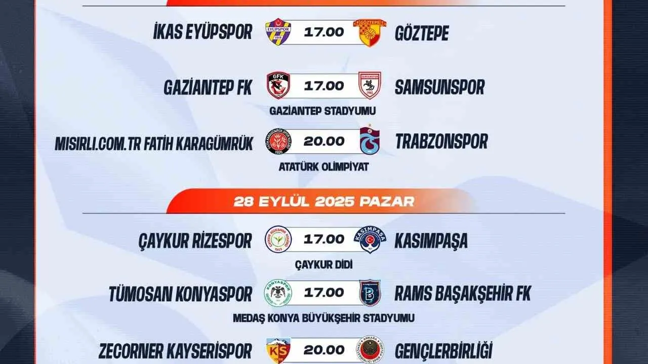 Trendyol Süper Lig’de 7-16. haftalar arasında oynanacak müsabakaların programı belli oldu. TFF’nin sitesinden yapılan açıklamaya göre, Süper Lig Kulüpler Birliği Vakfı’nın müsabaka saatlerinde değişiklik yapılması yönündeki başvurusu üzerine; Türkiye Futbol Federasyonu, Süper Lig Kulüpler Birliği Vakfı ve yayıncı kuruluş arasında yapılan çalışmalar neticesinde, 2025-2026 sezonunda oynanacak Trendyol Süper Lig Mehmet Ali Yılmaz Sezonu mücadelelerinde uygulanacak maç saatleri 14.30, 17.00 ve 20.00 olarak belirlendiği bildirildi.