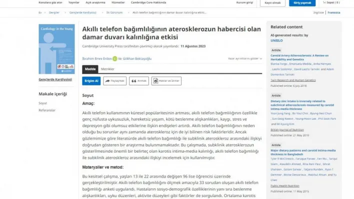 Sakarya’nın Adapazarı ilçesinde özel bir lisede 12’nci sınıf öğrencisi olan İbrahim Emre Erden’in, akıllı telefon bağımlılığı ile subklinik ateroskleroz (damar kalınlığı) arasındaki ilişkiyi incelediği ve TÜBİTAK’ın elediği proje, Dünyadaki en eski yayınevi ve en saygın akademik yayıncılar arasında yer alan Cambridge University Press’te yayımlandı.