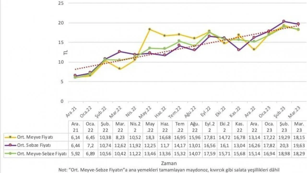 Araştırmaya göre martta peynir ve yoğurt fiyatları gerilerken, süt fiyatı artarak ilk kez litresi 25 lirayı aştı. Dana eti yüzde 13, kuzu eti yüzde 18, tavuk yüzde 4, yumurta yüzde 16, balık yüzde 8 zamlandı. Dana eti ilk kez ortalama 250 liranın üzerine çıktı. Baklagillerden fasulyenin fiyatı yüzde 10 gerilerken, yeşil ve kırmızı mercimek fiyatları yüzde 4 yükseldi. Nohudun fiyatı sınırlı düzeyde arttı, yağlı tohumlarda fiyat değişmedi.
