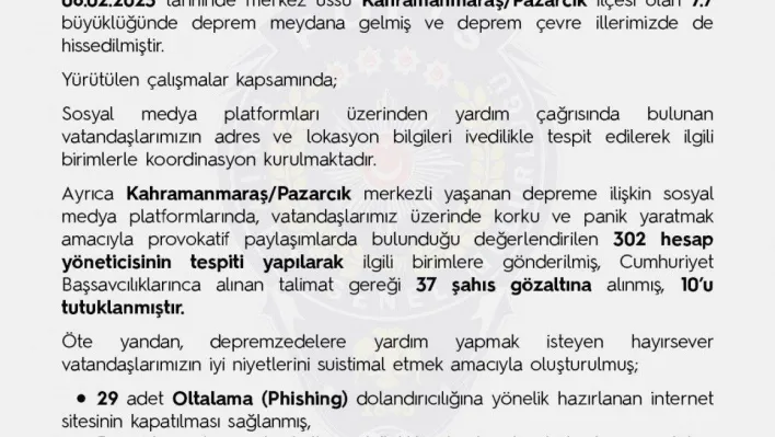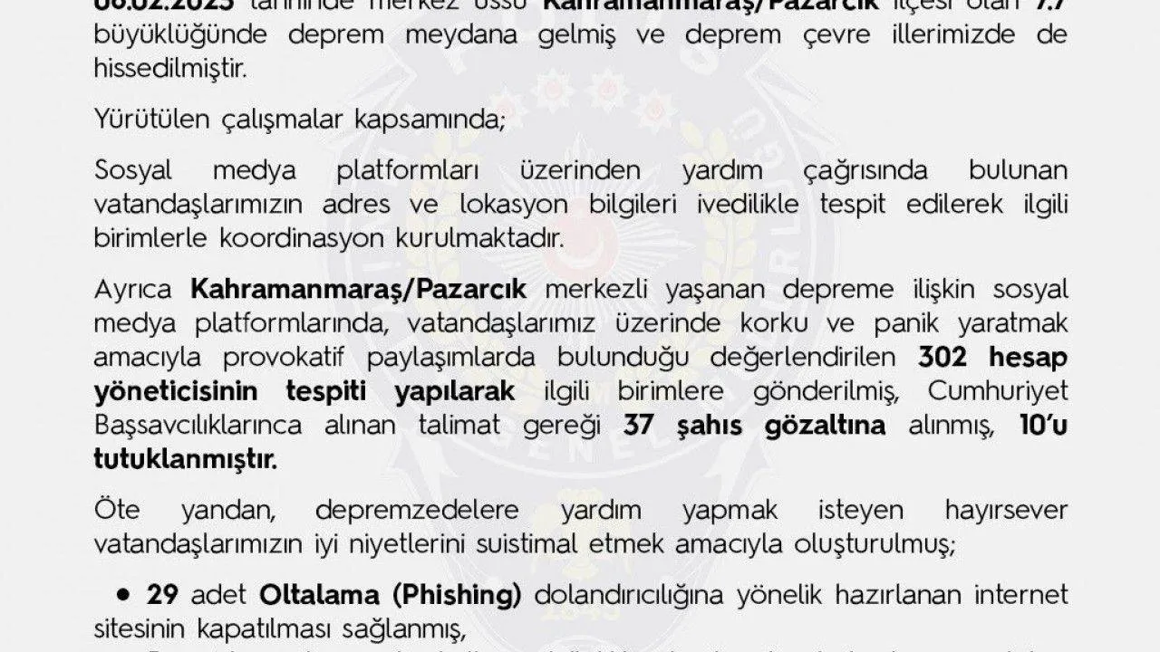 Sosyal medya platformları üzerinden yardım çağrısında bulunan vatandaşların adres ve lokasyon bilgilerinin hızlı bir şekilde tespit edilerek ilgili birimlerle koordinasyon kurulduğunu duyuran EGM, depreme ilişkin sosyal medya platformlarında, vatandaşı korku ve paniğe sevk edecek provakatif paylaşımlarda bulunan 302 hesap yöneticisinin tespitinin yapıldığını, Cumhuriyet Başsavcılığınca alınan talimatlar gereği 37 şahıs gözaltına alındığını, 10 kişinin tutuklandığını bildirdi.