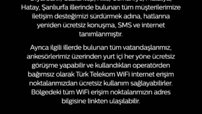 ’’Deprem bölgesinde iletişimin devamlılığı için Türk Telekom olarak var gücümüzle çalışmalarımıza devam ediyoruz. Kahramanmaraş, Adıyaman, Adana, Diyarbakır, Gaziantep, Kilis, Osmaniye, Malatya, Hatay, Şanlıurfa illerinde bulunan tüm müşterilerimize iletişim desteğimizi sürdürmek adına, hatlarına yeniden ücretsiz konuşma, SMS ve internet tanımlanmıştır.