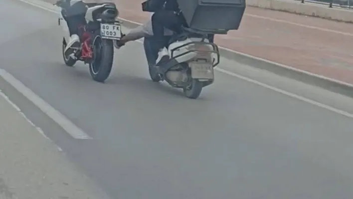 Bursa’da bozulan motosikleti başka bir motosiklet ile iterek tamirhaneye götüren gençler kameraya yakalandı.
