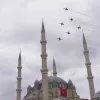 Mimar Sinan’ın eşsiz şaheseri Selimiye Camii üzerinde akrobatik manevralar yapan Türk Yıldızları, gökyüzünü adeta kırmızı beyaza boyadı. Yaklaşık yarım saat süren gösteride ay yıldızlı jetlerin senkronize uçuşları, meydanı dolduran binlerce Edirneli tarafından büyük beğeniyle izlendi. Vatandaşlar gökyüzündeki gösteriye alkışlarla eşlik ederken, ellerindeki Türk bayraklarıyla pilotlara sevgi gösterisinde bulundu. Gösteriyi izleyenler, bu tarihi anı cep telefonlarıyla kaydederek ölümsüzleştirdi.