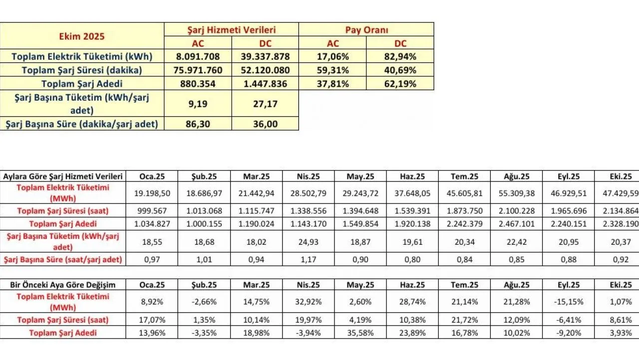 "Ekim ayı verilerine göre ülke genelinde 36 bin 361 adet şarj noktasında (soketinde) toplam 2 milyon 328 bin 190 adet şarj işlemi gerçekleştirilmiştir. Bu işlemler sonucunda 2 milyon 134 bin 864 saate karşılık gelen toplam şarj süresiyle birlikte 47 bin 429 megavat düzeyinde elektrik tüketimi gerçekleşmiştir. Gerçekleşen toplam elektrik tüketiminin yaklaşık yüzde 61’lik kısmı, kullandığı elektrik enerjisinin yüzde 100’ü yenilenebilir enerji kaynaklarından sağlandığı YEK-G (Yenilenebilir Enerji Kaynak Garanti) Belgesi ile belgelendirilen yeşil şarj istasyonlarında gerçekleştirilmiştir. Ekim 2025’te şarj istasyonlarında en yüksek elektrik tüketimi 14 bin 438 megavat ile İstanbul’da gerçekleşti. İstanbul’u Ankara, İzmir ve Bursa takip ederken, toplam tüketim içinde en yüksek payı da yüzde 30,25 ile İstanbul aldı. Markalar arasında en yüksek elektrik tüketimi 11 bin 292 megavat ile Trugo tarafından yapılırken, onu 8 bin 463 megavat ile Zes izledi. Eşarj, Astor ve Tesla ise tüketim sıralamasında ilk beş marka içinde yer aldı."