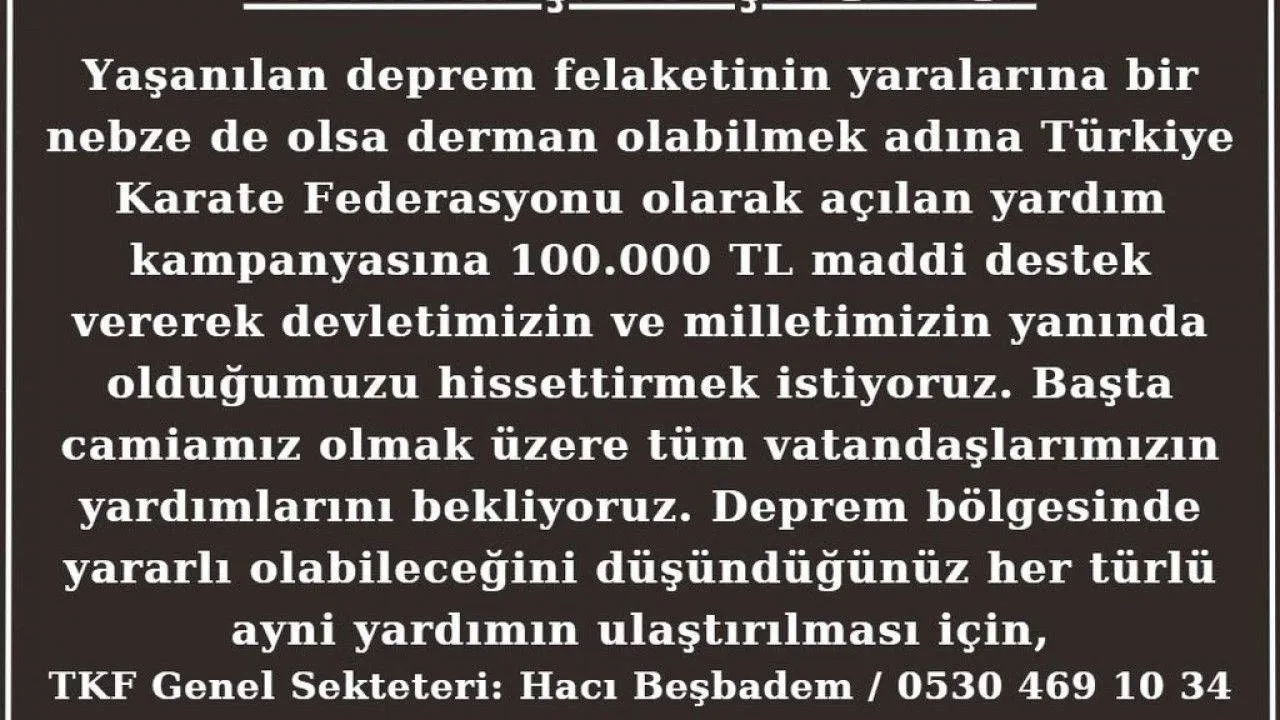Türkiye Karate Federasyonu, merkez üssü Kahramanmaraş ve çevre illerde depremden etkilenen depremzedeler için 100 bin TL destek olacağını açıkladı. Federasyonun resmi internet sitesinden yapılan açıklamada, "Yaşanılan deprem felaketinin yaralarına bir nebze de olsa derman olabilmek adında Türkiye Karate Federasyonu olarak açılan yardım kampanyasına 100 bin TL maddi destek vererek devletimizin ve milletimizin yanında olduğumuzu hissettirmek istiyoruz. Başta camiamız olmak üzere tüm vatandaşlarımızın yardımlarını bekliyoruz" ifadelerini kullandı.