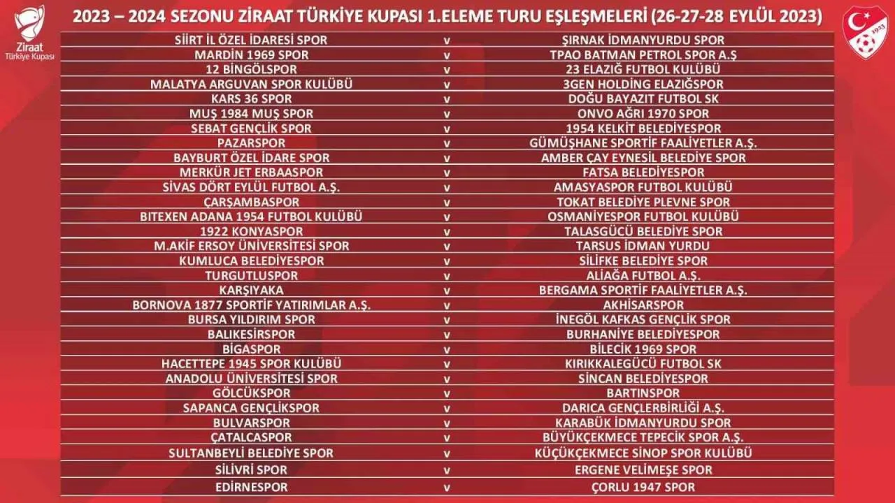 Ziraat Türkiye Kupası 1. Eleme Turu eşleşmeleri belli oldu. 62 takımın mücadele edeceği ve tek maç eleminasyon sistemine göre yapılacak 1. Eleme Turu karşılaşmaları 26, 27 ve 28 Eylül tarihlerinde oynanacak.