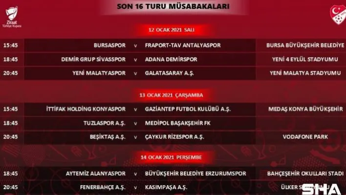 Ziraat Türkiye Kupası Son 16 Turu’nda oynanacak maçların planlaması duyuruldu. TFF’nin resmi sitesinden açıklanan 12, 13 ve 14 Ocak 2021 tarihlerinde oynanacak müsabakaların programı şöyle: