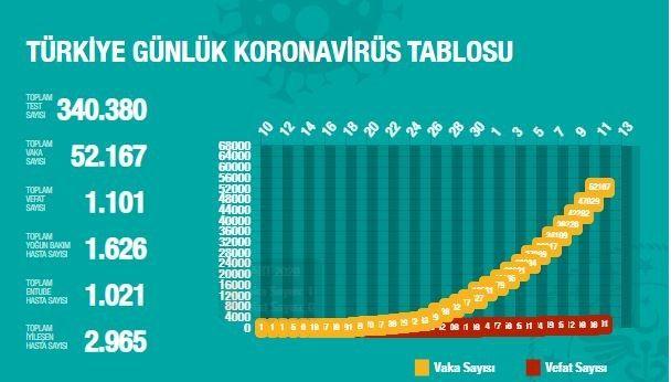 Sağlık Bakanlığı, son 24 saatte korona virüs nedeniyle 95 kişinin hayatını kaybettiğini, toplam can kaybının bin 101 olduğunu açıkladı. Açıklamaya göre bugün 33 bin 170 test yapılırken, 5 bin 138 yeni vaka oldu. Toplam vaka sayısı 52 bin 167'ye yükselirken, bugün iyileşen 542 kişi ile toplam iyileşen sayısı 2 bin 965 oldu.
