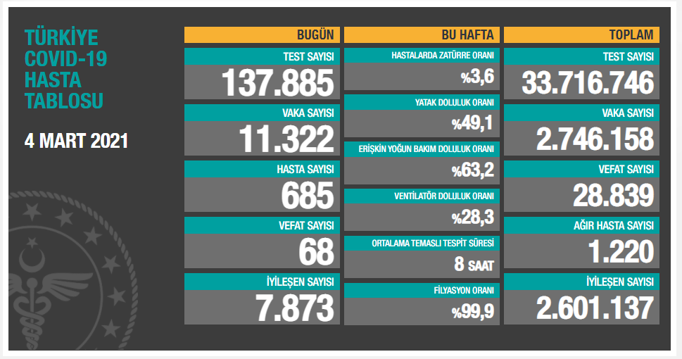 Türkiye'de son 24 saatte 11.322 koronavirüs vakası tespit edildi, 68 kişi hayatını kaybetti.