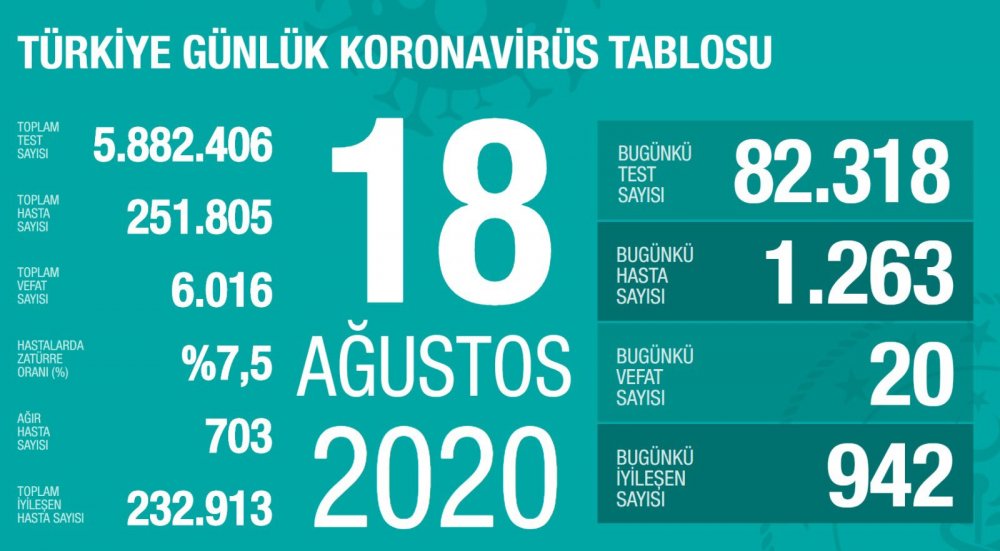 Türkiye'de son 24 saatte 1263 kişiye koronavirüs tanısı konuldu, 20 kişi hayatını kaybetti.