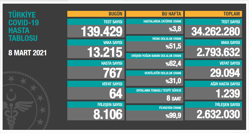 Türkiye'de son 24 saatte 13.215 koronavirüs vakası tespit edildi, 64 kişi hayatını kaybetti.