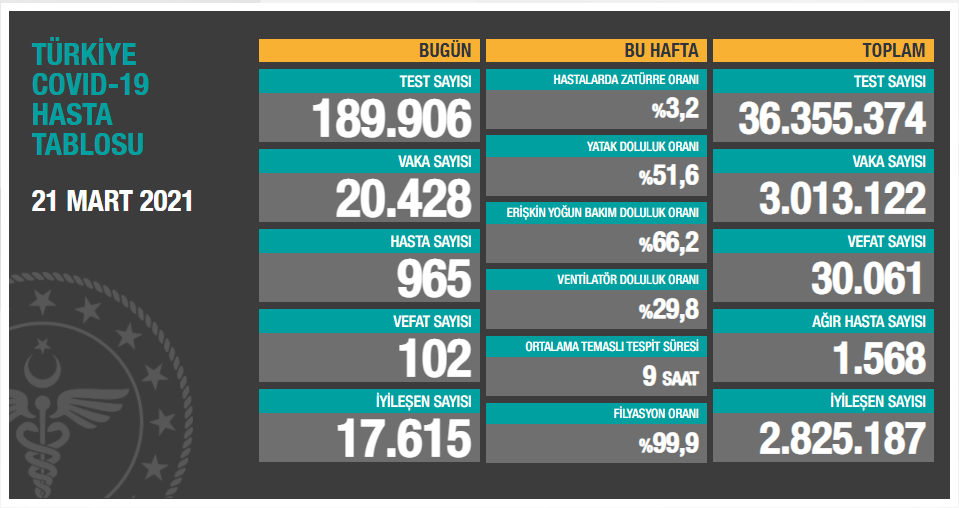 Türkiye'de son 24 saatte 20.428 koronavirüs vakası tespit edildi, 102 kişi hayatını kaybetti.
