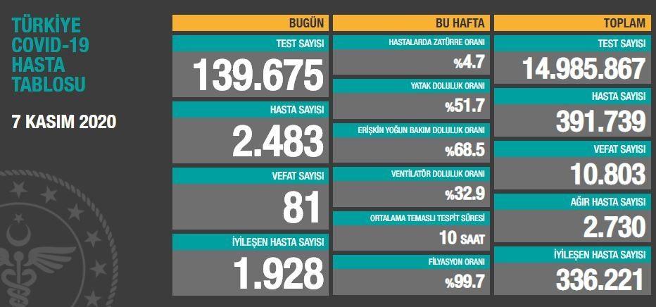 Türkiye'de son 24 saatte 2483 kişiye Kovid-19 hastalık tanısı konuldu, 81 kişi hayatını kaybetti.