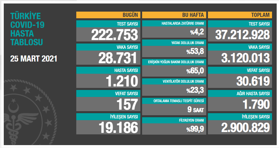 Toplamda 37 milyon 212 bin 928 test yapıldı. Bugün yapılan 222 bin 753 testten, 28 bin 731 yeni vaka sayısı, bin 210 kişi de yeni hasta sayısı olduğu belirtildi.