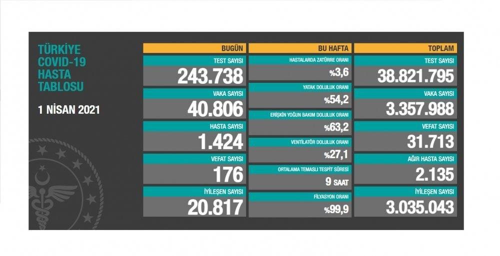 Türkiye'de son 24 saatte 40.806 koronavirüs vakası tespit edildi, 176 kişi hayatını kaybetti.