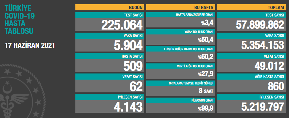 Bugün yapılan 225 bin 64 testten, 5 bin 904 yeni vaka sayısı, 509 kişi de yeni hasta sayısı olduğu belirtildi. Toplam vaka sayısının 5 milyon 354 bin 153 olduğu, bugün iyileşen 4 bin 143 kişiyle birlikte toplam iyileşen hasta sayısının 5 milyon 219 bin 797'e yükseldiği, toplam hastalarda zatürre oranının yüzde 3,4, ağır hasta sayısının ise 860 olduğu açıklandı.