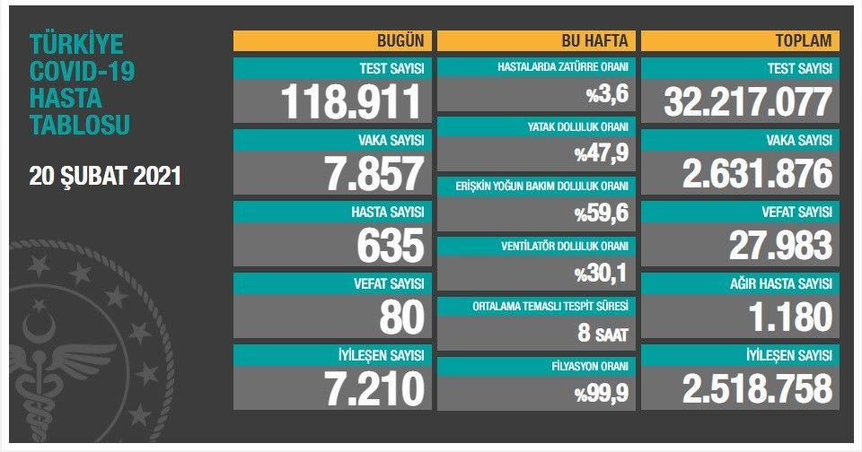 Türkiye’de son 24 saatte 7.857 koronavirüs vakası tespit edildi, 80 kişi hayatını kaybetti.