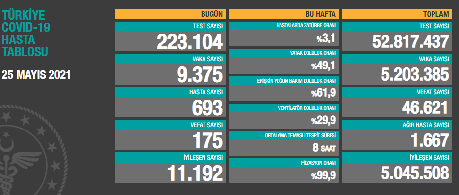 Sağlık Bakanlığının Covid-19 bilgilendirme sayfasında Türkiye'nin güncel korona virüs tablosu kamuoyuyla paylaşıldı. Tabloya göre son 24 saatte 175 kişi korona virüsten hayatını kaybetti, toplam can kaybı 46 bin 621'a yükseldi. Toplamda 52 milyon 817 bin 437 test yapıldı.