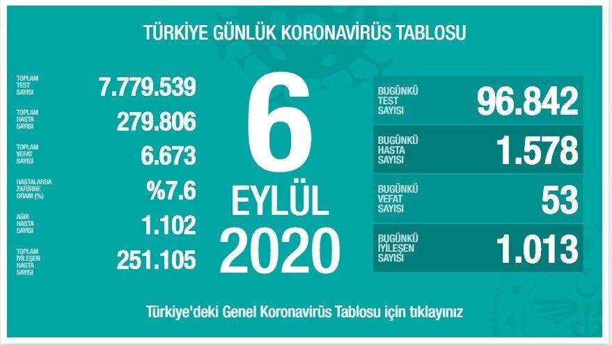 Sağlık Bakanı Fahrettin Koca, Twitter hesabından Türkiye Günlük Koronavirüs Tablosu'nu paylaştı. Buna göre, son 24 saatte 96 bin 842 kişiye korona virüs testi yapıldı, bin 578 kişiye virüs tanısı konuldu. 53 kişi hayatını kaybederken, bin 13 kişinin tedavisi tamamlandı.