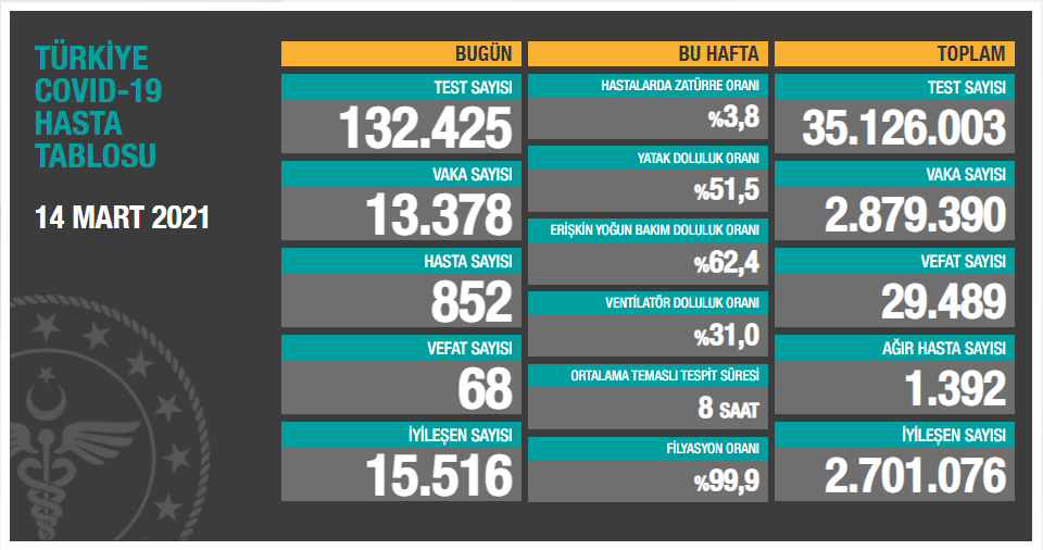 Sağlık Bakanlığı, son 24 saatlik korona virüs tablosunu açıkladı. Türkiye'de son 24 saatte 13.378 yeni koronavirüs vakası tespit edildi, 68 kişi hayatını kaybetti.