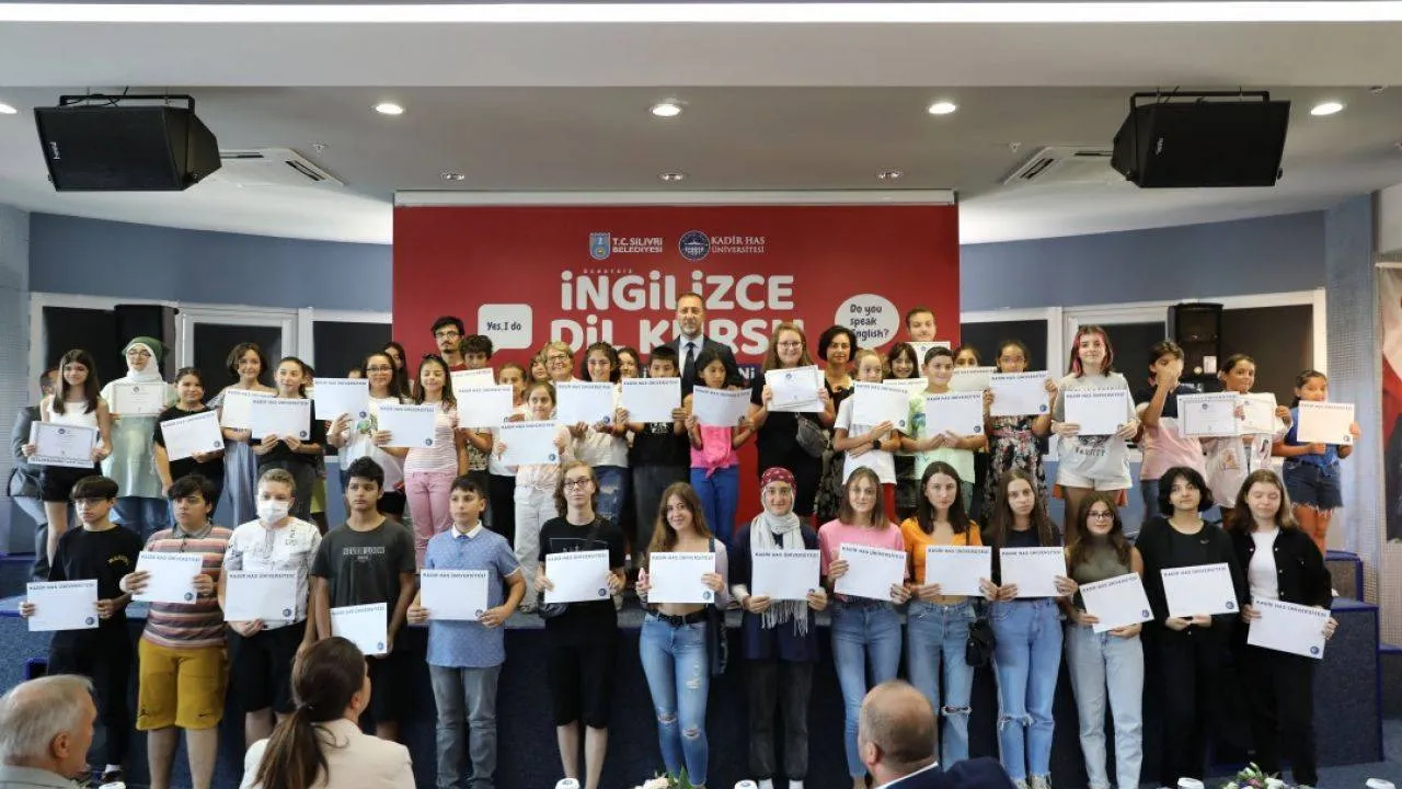 Silivri Belediye Başkanı Volkan Yılmaz’ın “Silivri’de 8. sınıfı bitiren her öğrenci bir yabancı dil konuşabilecek, lisanslı bir sporcu olabilecek, bir müzik aleti çalabilecek ya da sanatsal bir faaliyette bulunabilecek” vizyonu doğrultusunda çalışmalarını sürdüren Silivri Belediyesi, hayata geçirdiği bir projenin daha ilk meyvelerini aldı. Silivri Belediyesi ve Kadir Has Üniversitesi iş birliğiyle gerçekleştirilen ücretsiz İngilizce kursu projesinde sertifika heyecanı yaşandı. 1-30 Ağustos 2022 tarihleri arasında düzenlenen yabancı dil kursunu tamamlayan öğrenciler için Kadir Has Üniversitesi Selimpaşa Yerleşkesinde sertifika töreni düzenlendi. 10-17 yaş aralığındaki öğrencilerin katılım sağladığı ücretsiz İngilizce kursunda ortaokul ve lise öğrencileri, eğlenerek yabancı dil öğrenmenin keyfini çıkardı.