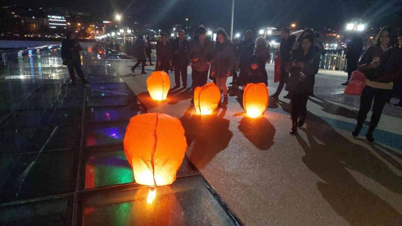Uçurdukları dilek fenerleri ile kadına şiddete dikkat çektiler